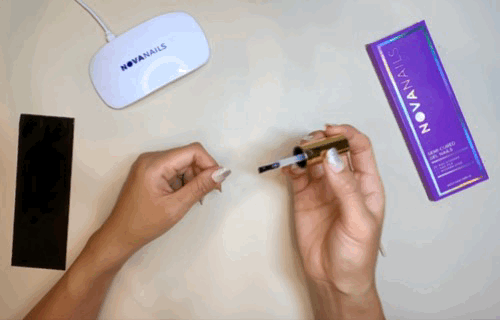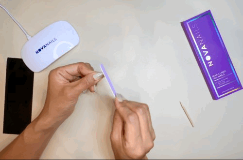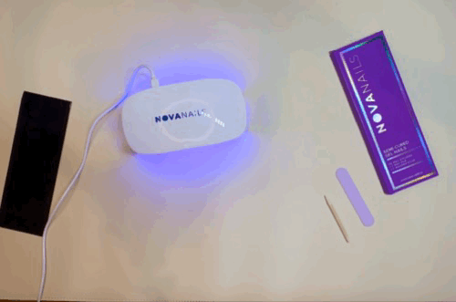 Press the "ON" button on our Nova Nail Lamp and place your hand under the light for 1 or 2 cycles (~1 minute). The curing process will harden the gel sticker completely!